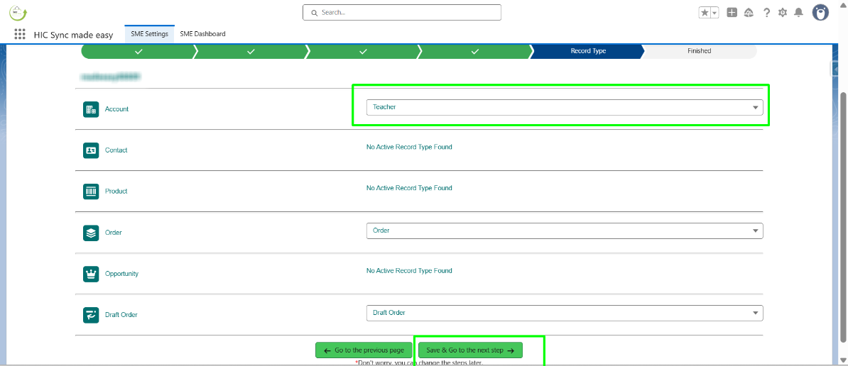 After selecting record types for the objects, click Save & Go to the Next Step. The selected record types will be applied to newly synced Shopify records.
