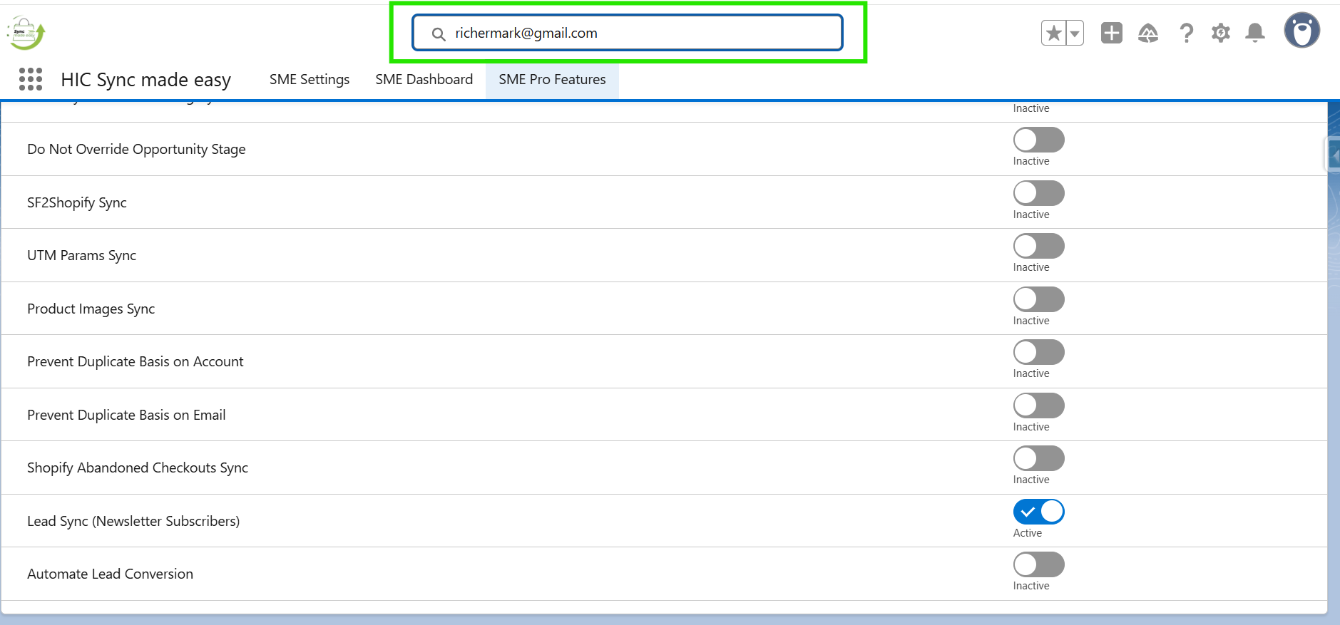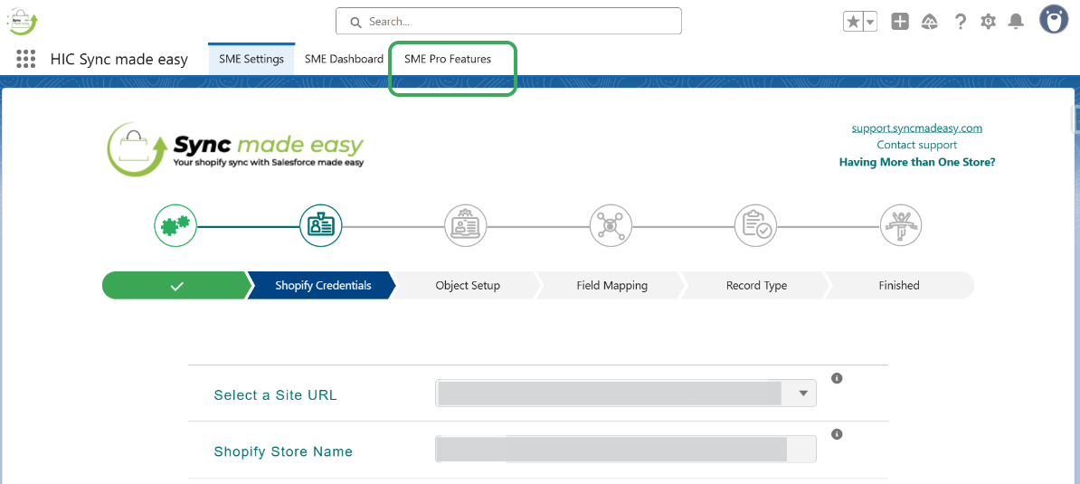 Step 1: Open your Salesforce Organization and navigate to the “SME Pro Features” tab. Make sure the package is installed from the AppExchange and the Shopify store is connected to Salesforce.
