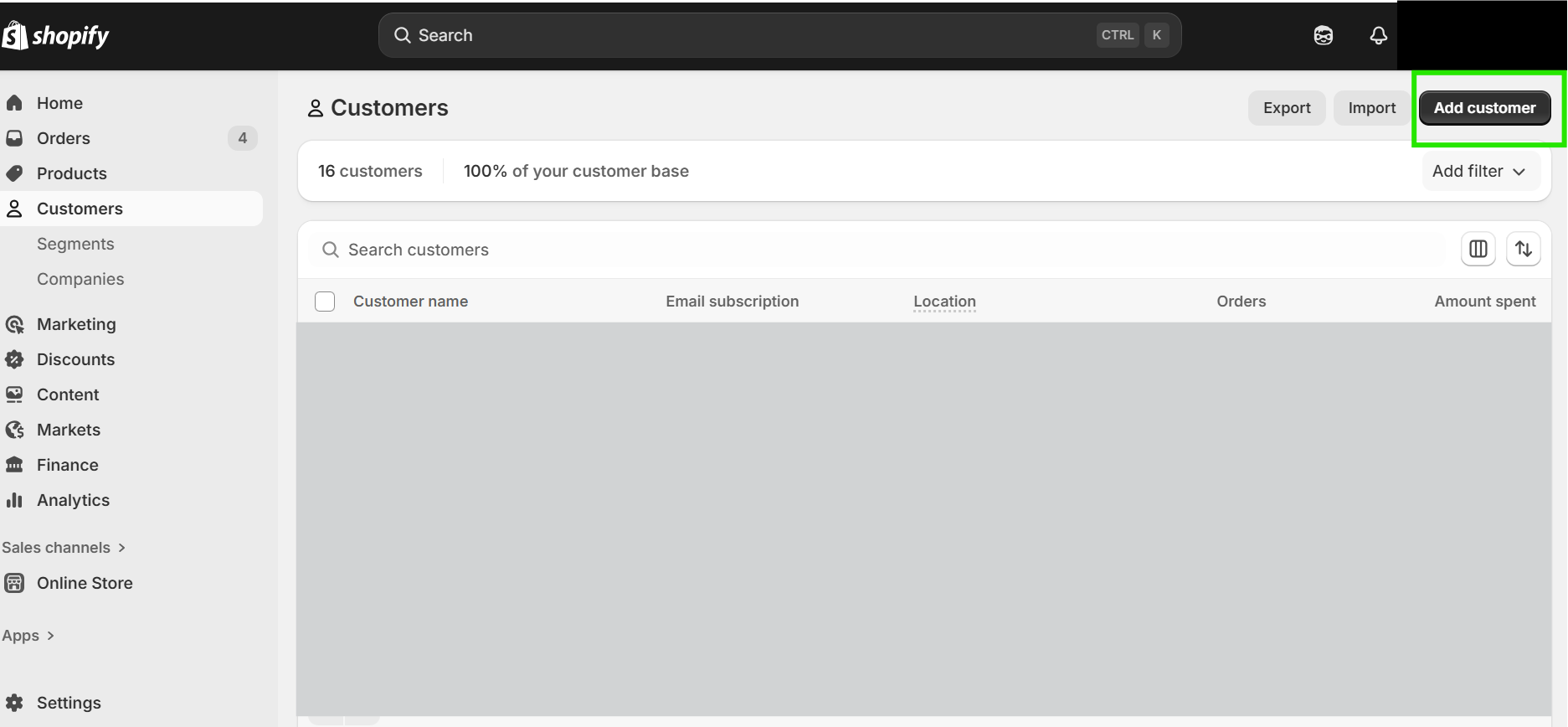 Step 3: Go to your Shopify Store and create a new Customer by clicking “Add Customer”.