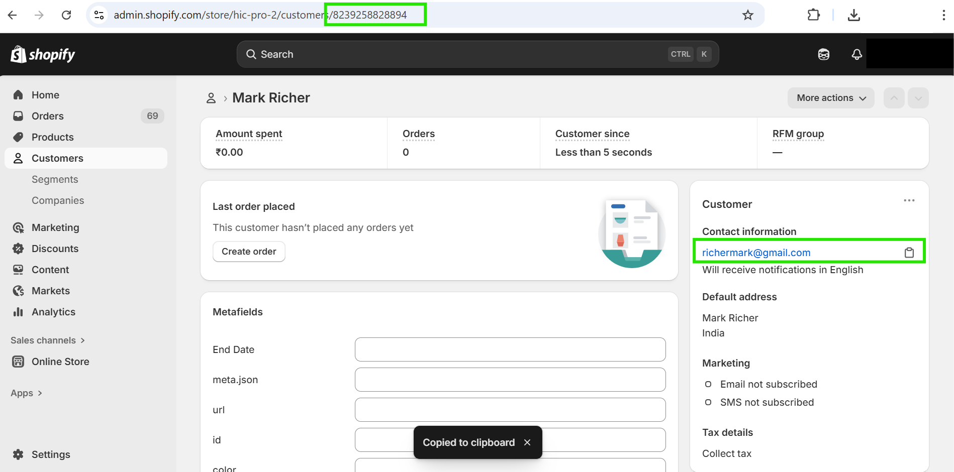 Step 5: Copy the “Customer Email address” or “Shopify ID” from the respective Customer.