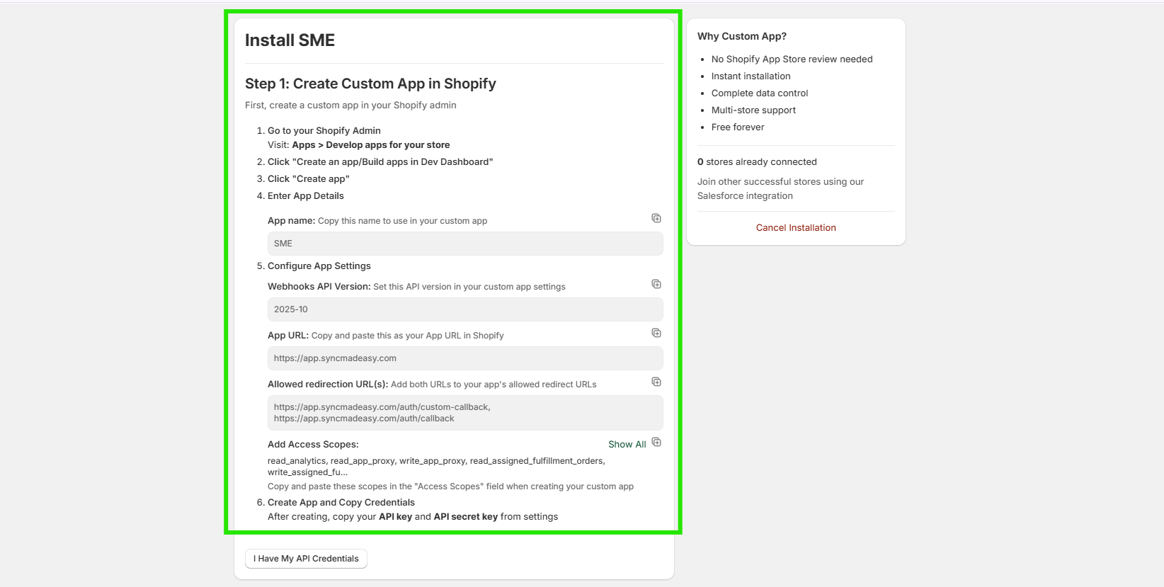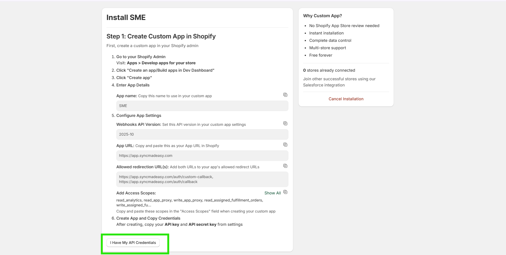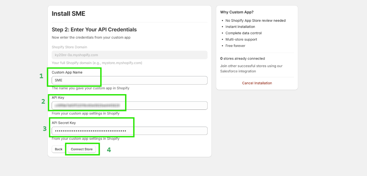 Step 17: Fill the API Key and API Secret Key. If you give name of your app except Sync Made Easy, then also change the app name, and then click the "Connect Store" Button.