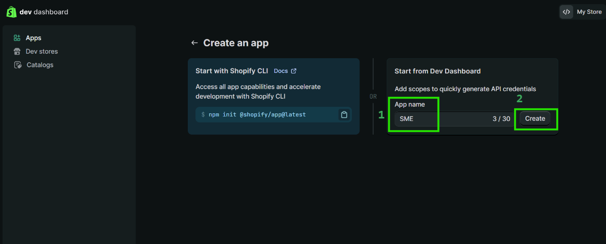 Step 11: In the dev dashboard, click on "Create app".