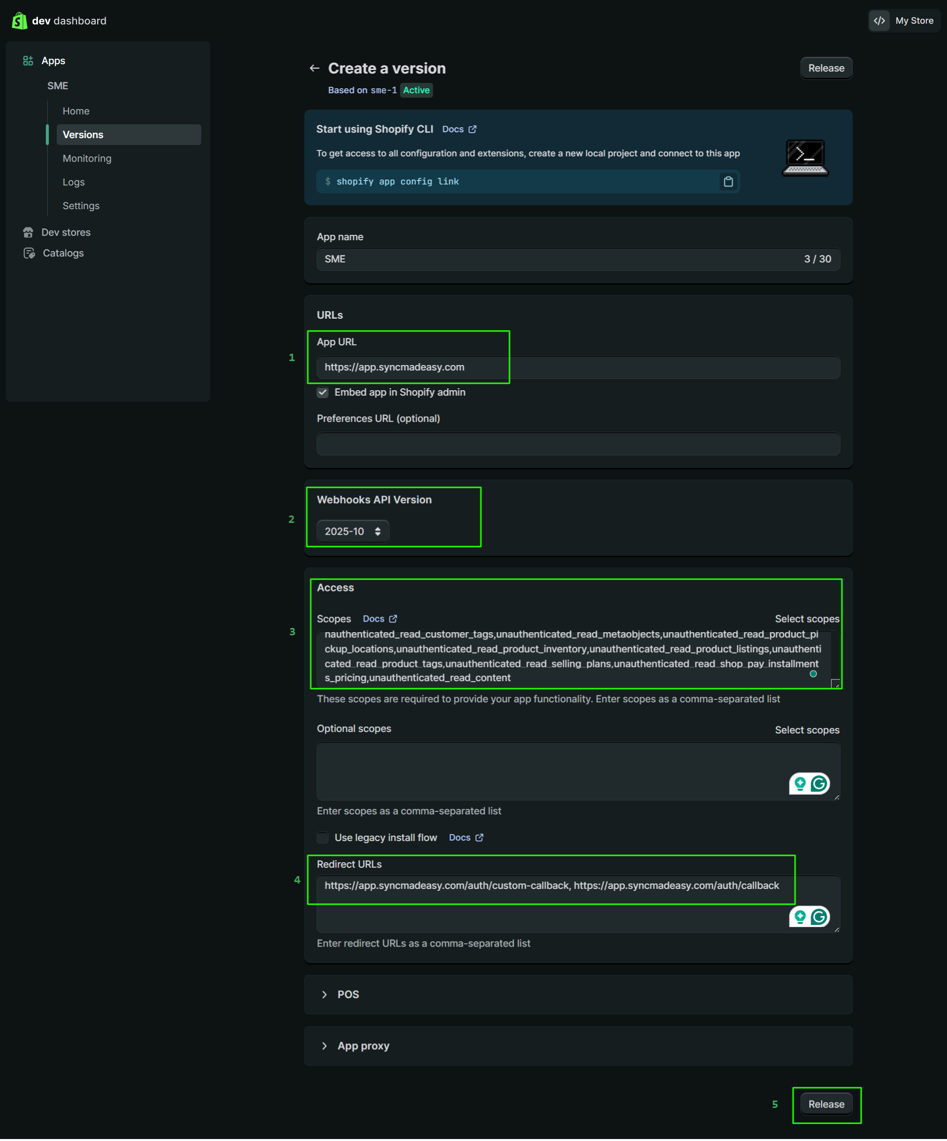Step 13: Add App URL, select Webhook API version, Access scopes, and add redirect URL (You can directly copy and paste from the Install page of the app), and then click the release button.