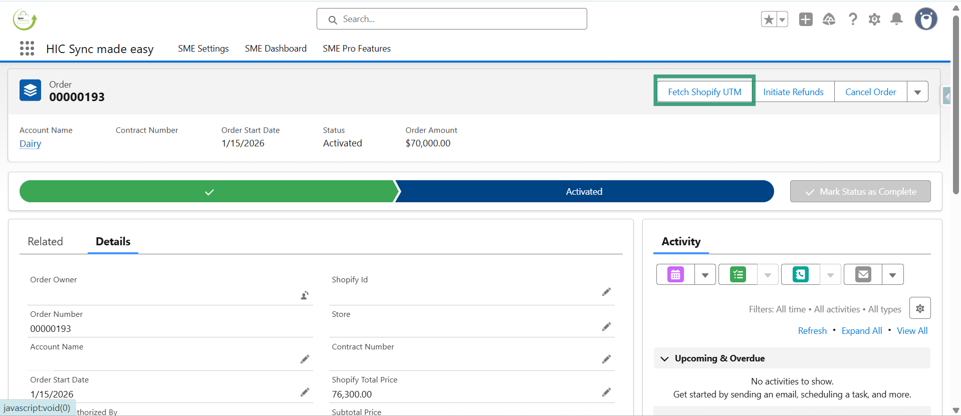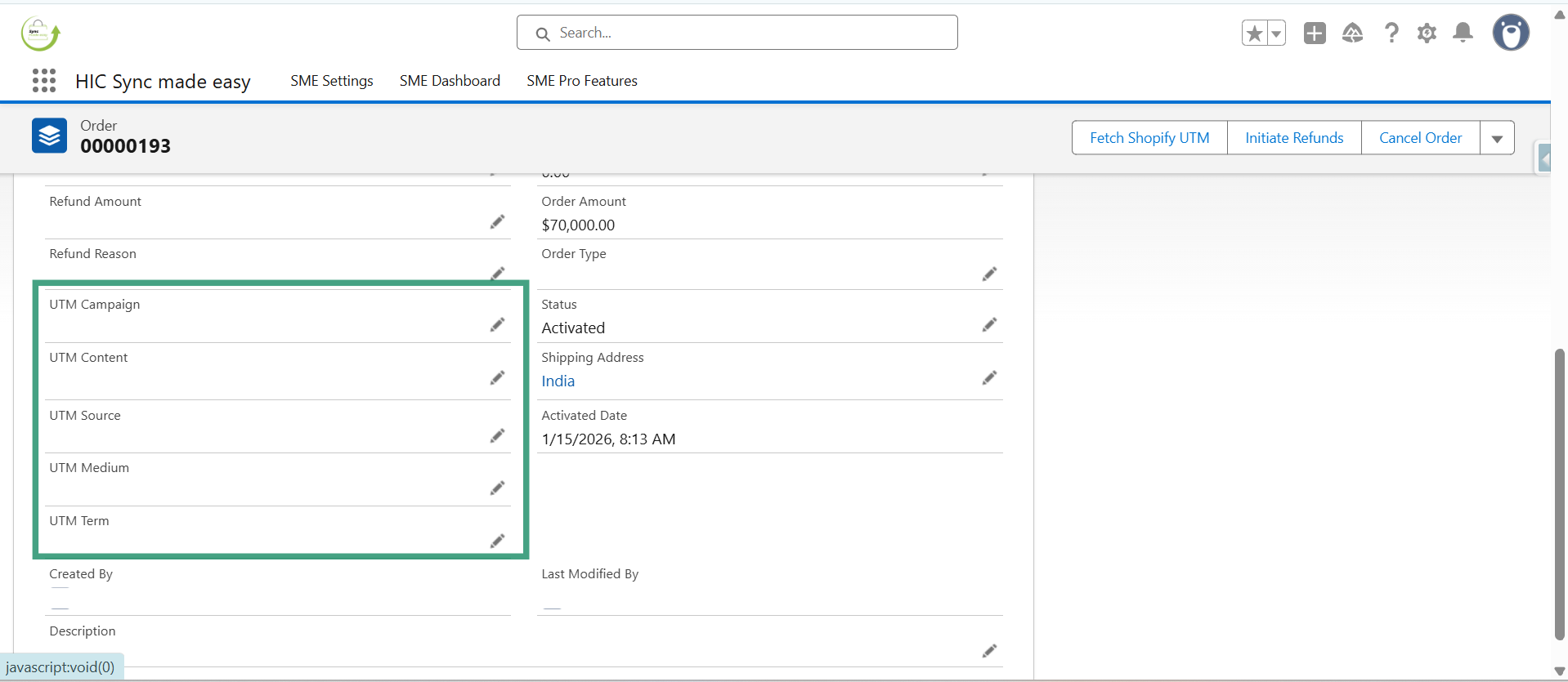 NOTE: Since UTM data is live data, if an order contains UTM information in Shopify, it will automatically sync to Salesforce Production Org in the UTM field when you click the “Fetch Shopify UTM” button