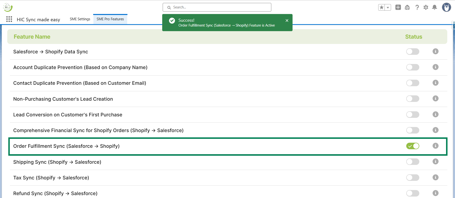 Step 3: Enable the “Order Fulfillment Sync (Salesforce → Shopify)” feature toggle button.