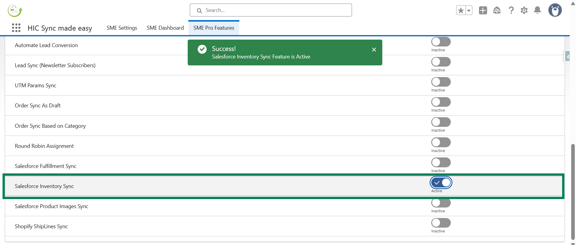 Step 4 - Enable the “Salesforce Inventory sync” feature by clicking on the toggle button.