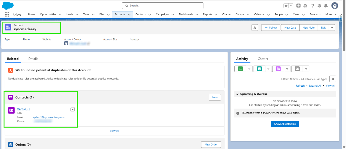 Step 5: Open the Account record and verify that the account name matches the customer’s email domain. You will also see that one Contact has been created under that account.