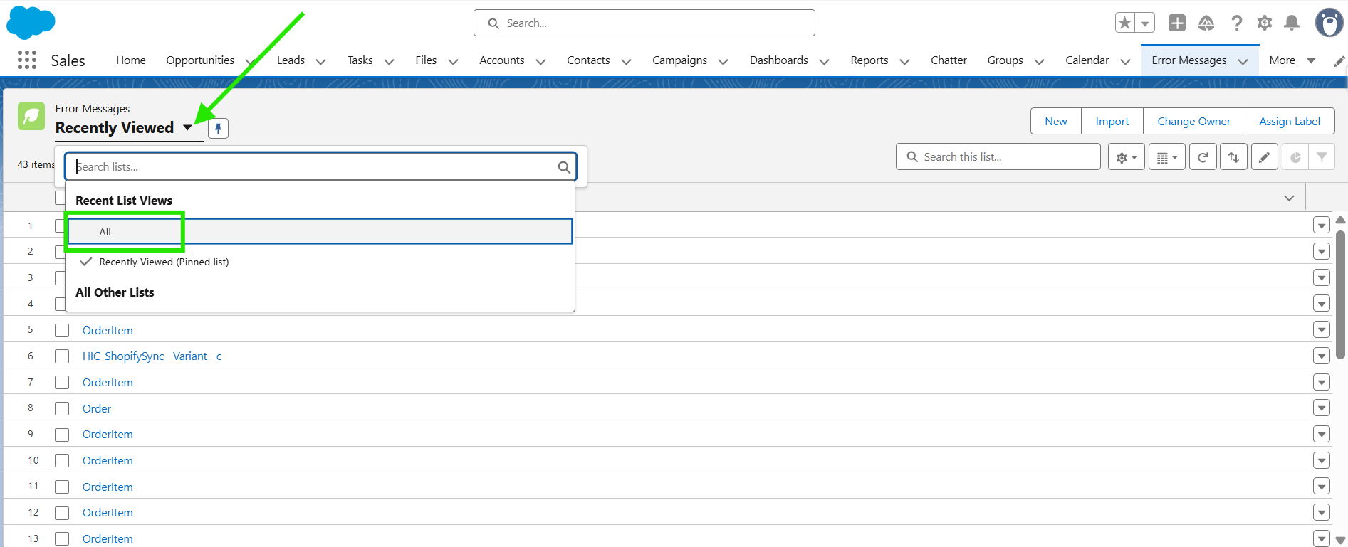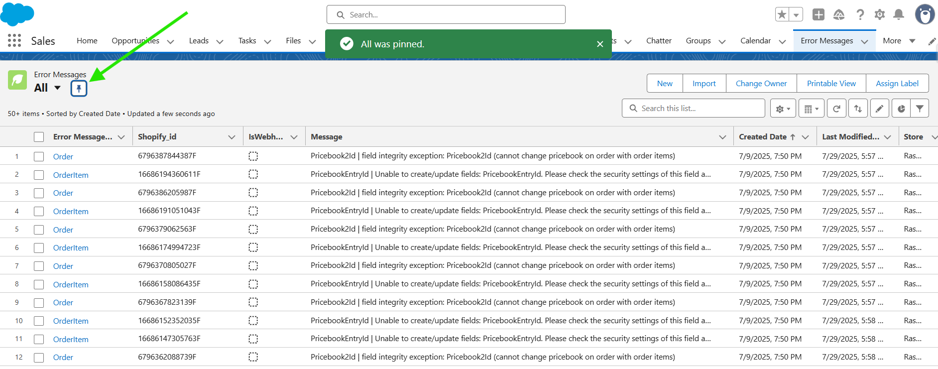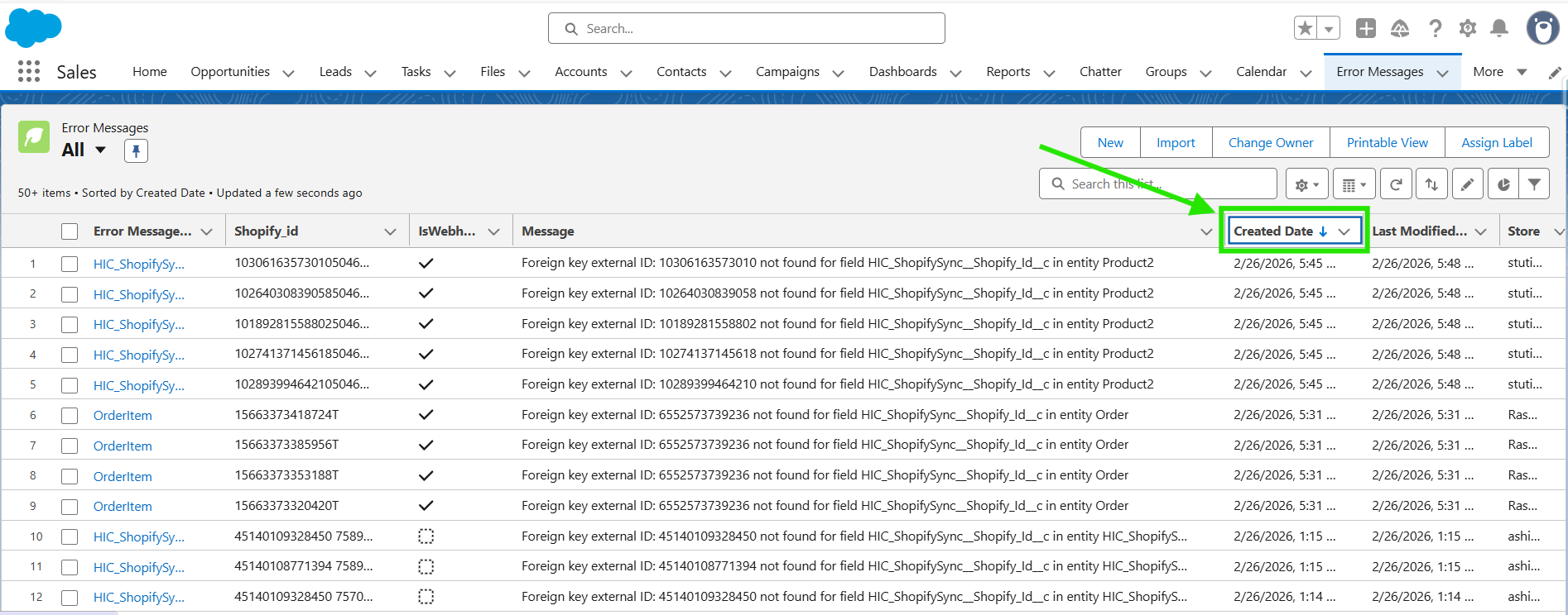 Step 4: Click on the “Created Date” column to sort the records and view the most recently generated error messages.