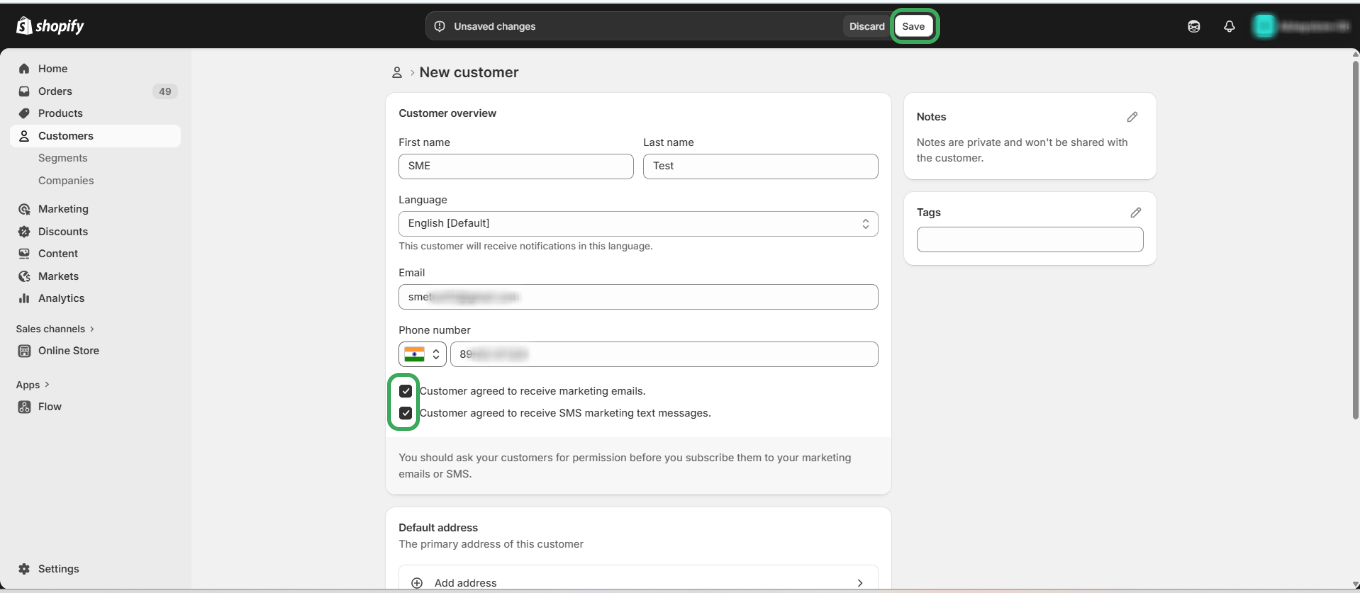 Step 3: Enter all required customer details, including email and phone number, then select the checkboxes to opt in for marketing emails and messages and then click on Save.